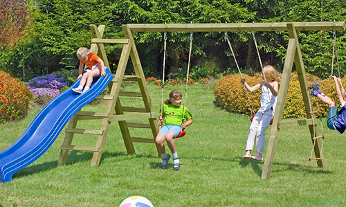 kompletter Bausatz inkl. Beschläge, Vierkantpfosten 9×9 cm, Schaukelbalken 9×9 cm, seitliche Leiter mit Podest H 141 cm, 5 Schaukelhaken, 2 Kunststoffschaukelbretter, 1